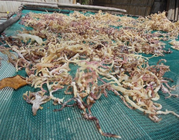 The seaweed is sun dried on large set ups of tanning racks and beds.