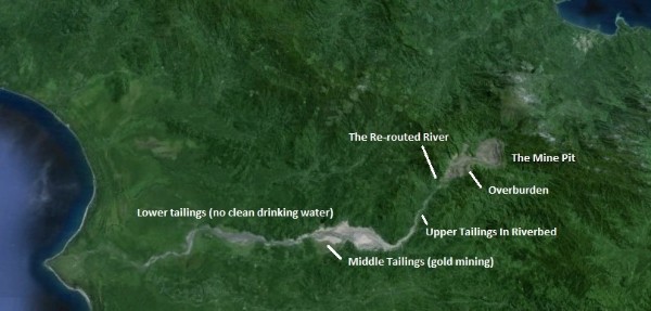 Figure 1. An aerial view of the BCL Panguna mine site. From the mine pit to the end of the lower tailings is approximately 18km and at its widest is about .75km. The diversion of the river around the mine site rejoins the former natural river bed below the Overburden primary deposition and diverts not more than 40% of the natural river flow (which now runs blue with copper beneath the overburden and through the tailings).